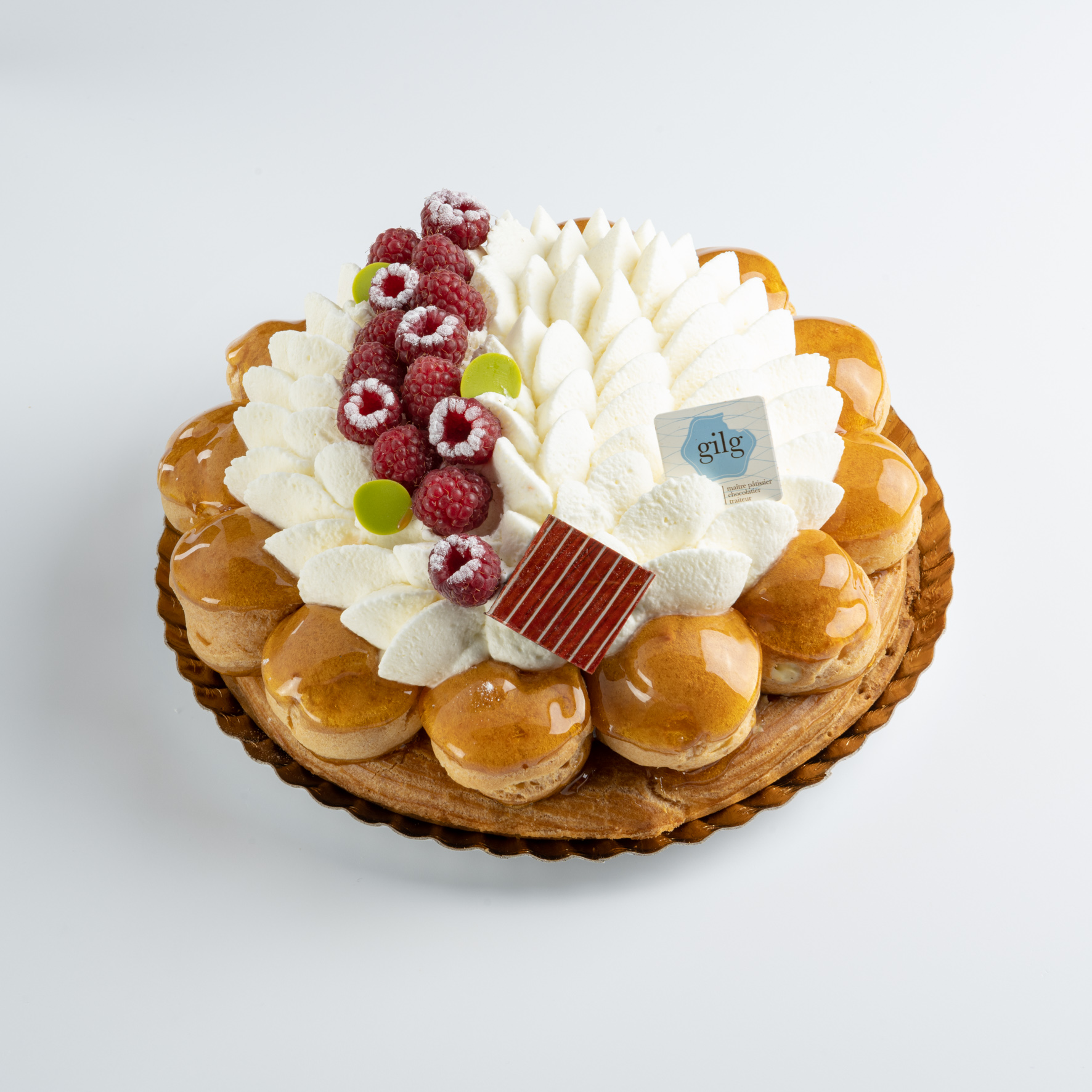 Crème pâtissière vanille parsemée de framboises fraîches, pâte à choux, choux caramélisés, chantilly