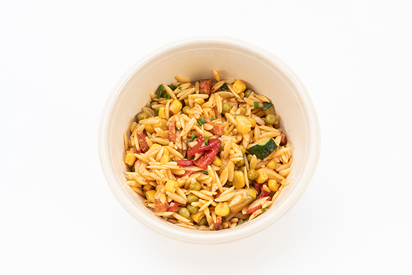 salade de pépinettes (mini pâtes), maïs, thon, ciboulette, tomates, poivrons, oignons, vinaigrette