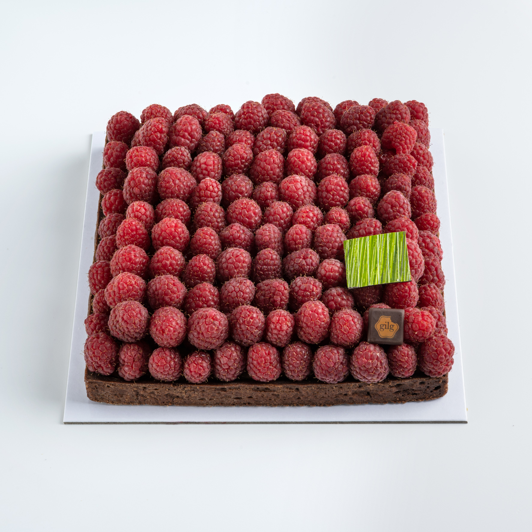 framboises sur crémeux pistache et pâte sablée au chocolat, décor en chocolat